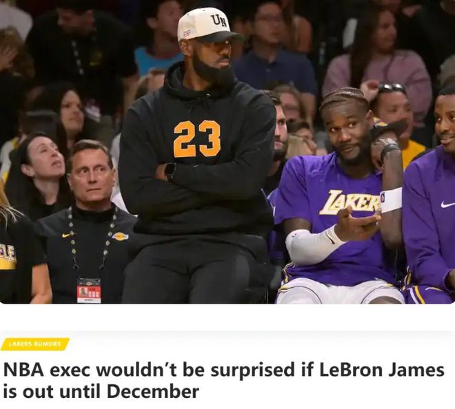 不过,詹姆斯已经年近41岁,是NBA现役球员中年龄最大的,他的身体恢复速度已经大不如从前,一位NBA高管向《湖人日报》透露,如果詹姆斯10月甚至11月都无法出战,都不会感到惊讶。这位高管还表示,湖人管理层正在谨慎对待詹姆斯的这次伤病,将采取极为保守的态度,也许延续到12月再复出也有可能。