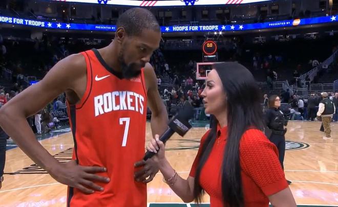 北京时间今日,在NBA常规赛中,火箭队在客场以122-115击败了雄鹿队。赛后,火箭球星杜兰特接受了采访。
